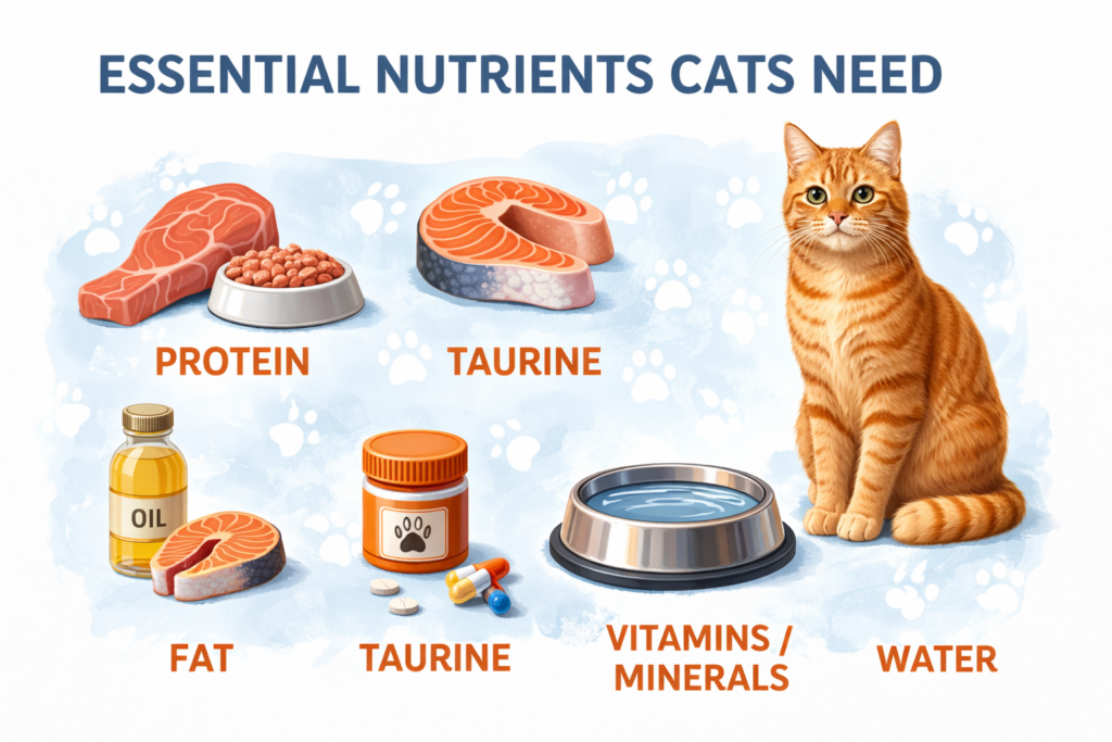 Let’s break down the essential nutrients for cats in plain English. These are the basics your cat needs every day to stay healthy, happy, and sharp: